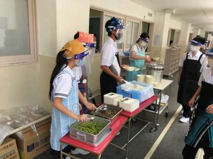 今朝、フェイスシールドが配布され、給食の配膳の時などに使われています。先生に指示された時以外も必要に応じて自分の判断で使用してください。フェイスシールドを着用しているときに気分が悪くなったり、体調に変化があったりした場合は、すぐにはずすようにしてください。自分や仲間をコロナウイルス感染症から守るために有効に使ってください。