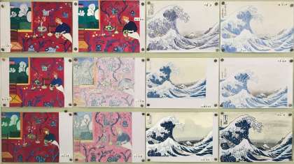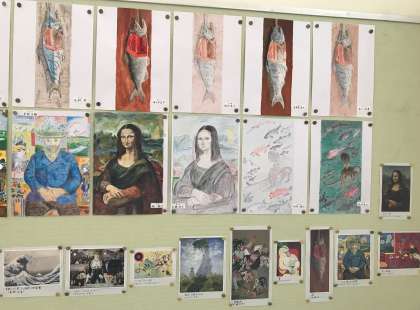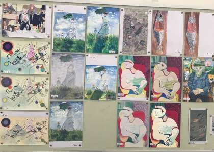 休業中の美術の課題の「模写」です。印象派から現代絵画までの中から各自が選んで、色をつけています。ていねいに色を付けています。本館の階段踊り場に展示されているので、時間があるときに見てください