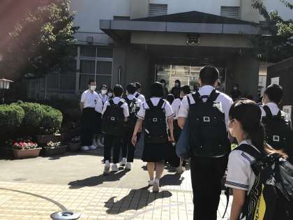 朝の登校風景です。生徒会役員の生徒も朝のあいさつ運動をしています。今週途中から