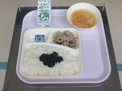 今日の給食の献立は「豚肉のごまみそ焼き」「すまし汁」です。