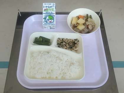 今日の給食の献立は「豚肉とじゃがいもの煮もの」「オクラの梅風味」です。