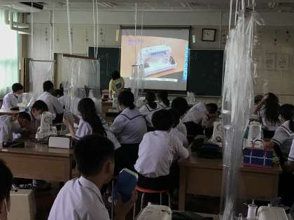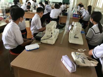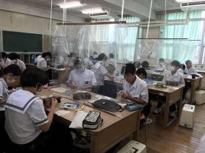 被服室は対面に座って授業を受けるので、感染症の予防のため、ビニール袋を加工したシートを設置しています。中・下段の画像は、今日の土曜授業でミシンの使い方を学習しているところです。