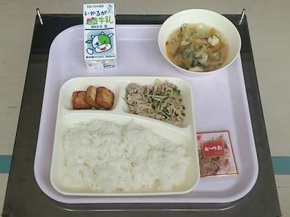 今日の給食の献立は「ゴーヤチャンプルー」です。