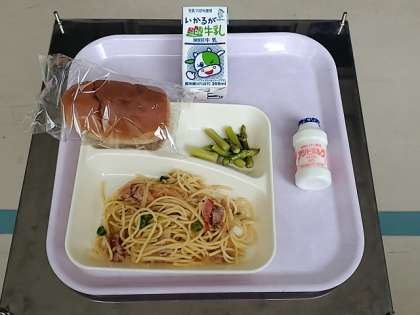 スパゲッティは生徒に人気のある献立です。栄養バランスを考え野菜もしっかり食べましょう。今日の給食も残さずに美味しくいただきましょう。