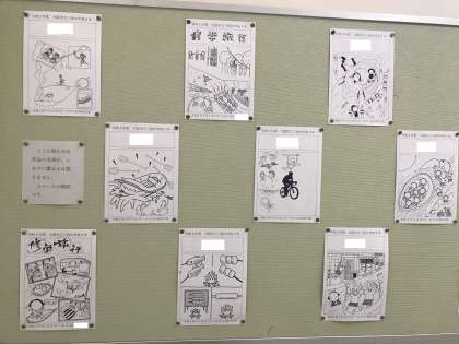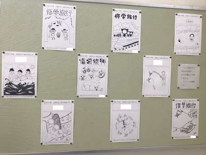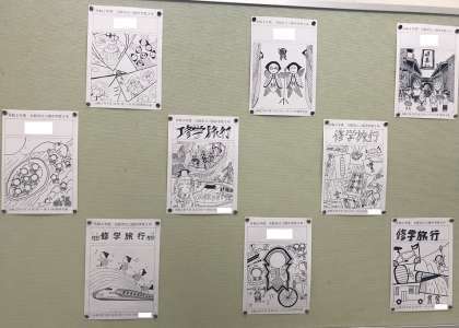「修学旅行のしおり」の表紙やしおり内のイラストに使うため、3年生から募集したものを西館の階段踊り場に掲示しています。高山土産の「さるぼぼ」人形が人気みたいです。