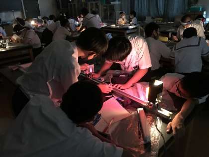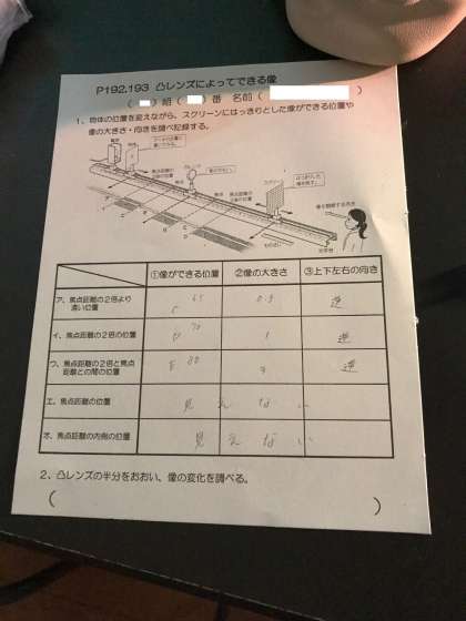 理科室で、「凸レンズによってできる像」の実験をしました。班で協力して実験し、結果をまとめました。