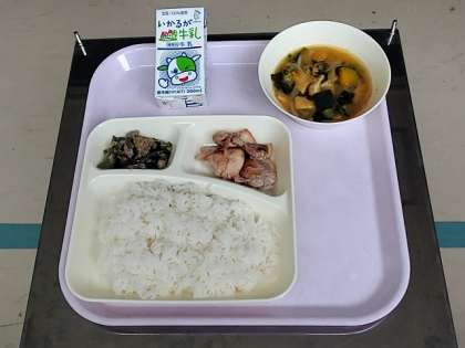 今日の給食の献立は「鶏肉のてり焼き」「なすのそぼろいため」です。
