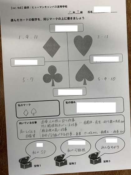 様々な性格を表す絵・文字のトランプの中から自分にあてはまる10枚を選び、“慎重” “アバウト” “理論家” “誠実” など、様々な面(サブパーソナリティー)から分析し、自己理解、自己受容を深めました。