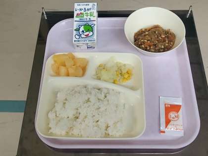 キーマカレーとは、ひき肉を使ったカレーのことです。給食では、ひき肉のほかに、ひきわり大豆も使用しています。大豆には、カルシウムや鉄、食物繊(せん)維(い)が豊富に含まれています。また、キーマカレーは小麦粉アレルギーに対応し米粉を使ったカレールウを使用、サラダのドレッシングは卵アレルギーに対応しノンエッグのドレッシングになっています。