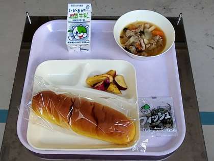 今日の給食の献立は「豚肉といかの中華煮」です。