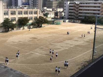 上段:体育大会のトラックの線を利用して、体育の授業に練習しいてタイムをとっています。