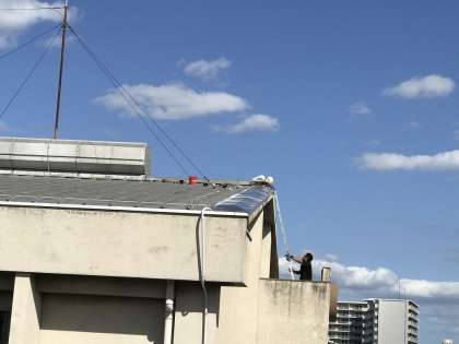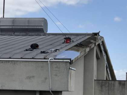 中・下段:体育館の屋根の補修です。2年前の台風で傷んで、修理はしたのですが、そのときの影響がまた別の場所で出たので補修しています。なお、ブロック塀のフェンスへの改修工事も3か所で進められています。