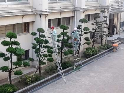 本校の管理作業員さんが、体育館周りの植木の選定を行っています。