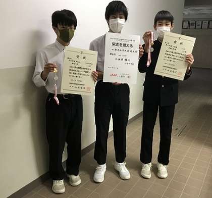 表彰では、陸上競技部の個人で、大阪市秋季総体男子共通800M第2位、男子三段跳び第2位、全日本中学生通信陸上競技大会共通男子砲丸投げ第8位(大阪)の生徒が表彰されました。