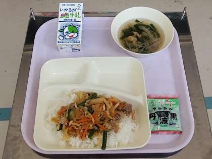 今日の給食の献立は「ピリ辛丼」「ソフト黒豆」です。
