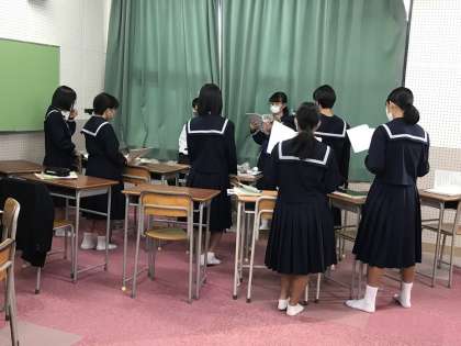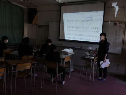 楽譜の記号・音声をプロジェクターで映して確認した後、パート別や全パートで合唱の練習をしました。