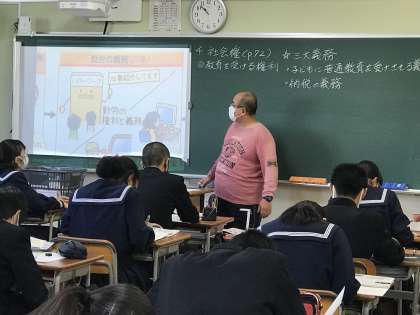 3年4組の社会は、「参政権と請求権」の単元で、書画カメラで教科書を投影して、ポイントを押さえながら、「生存権」「共育を受ける権利」など様々な権利について学習しました。