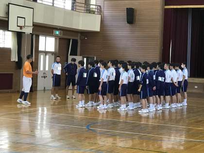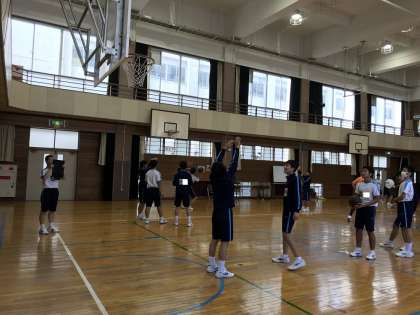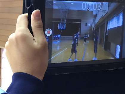 バスケットボールの基本ショットの応用として、レイアップシュットからフックショットの学習をしました。6グループに分かれて、ローテーションでタブッレトを使って撮影し、撮影後初めに説明した着眼点にもとづいてグループで確認し、修正しながら練習を進めました。
