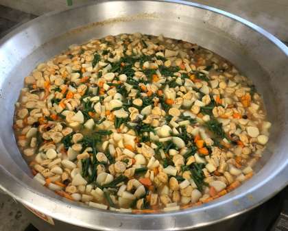含め煮は、野菜・芋などを、たっぷりの煮汁で味がしみ込むまで柔らかく煮た料理です。献立では、さといも、にんじん、だいこん、しめじ、さんどまめ、一口がんもと具だくさんです。野菜に出汁がしみ込んで、しかも、調理員さんが、一つ一つの野菜を愛情を込めて切ってくれています。