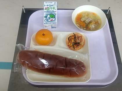 今日の給食の献立は「豚肉と野菜のスープ煮」「変わりピザ」です。