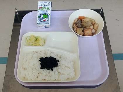 ごはんのおともに、今日はのりつくだ煮がついています。つくだ煮は、大阪佃村(現在の大阪市西淀川区佃)で作られていた小魚を煮た保存食が始まりと言われています。今は、塩やしょうゆ、砂糖などで小魚やこんぶ、貝などいろいろな材料を煮込んだつくだ煮が作られています。