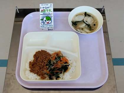 今日の給食の献立は「ドライカレービビンバ」「トック」です。