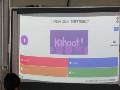 後半は、テスト範囲の復習を「カフート(Kahoot)」というソフトを使って、前に投影された問題にダブレットで答えるゲーム形式での活動をしました。