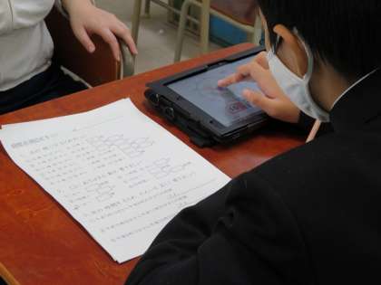 「時計の、〜分後、〜分前の違いを知ろう」の学習を、タブレットの時計のアニメーションを活用し、針を動かしながら問題を解いていきました。