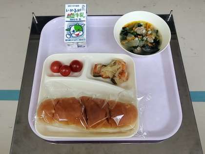今日の給食の献立は、「さけのマリネ」「肉だんごと麦のスープ」です。