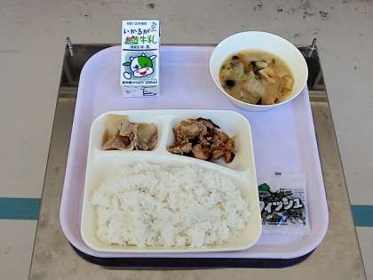 今日の給食の献立は、「鶏肉の甘辛焼き」「だいこんの煮もの」です。