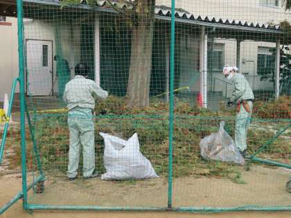 園芸班の方が来られて、管理作業員さんと校門付近や校庭の樹木の剪定をしています。真冬に備えて、樹木もさっぱりした姿にしていただきます。