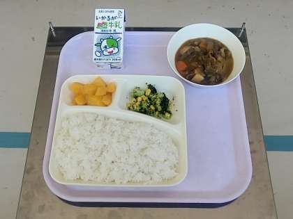今日の給食の献立は、「冬野菜のカレーライス」「ブロッコリーとコーンのサラダ」です。