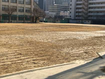 朝、霜が降りて雪のあとのようになっていました。その後、校庭は使えなくなってしまいます。