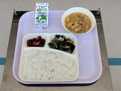 今日の給食の献立は、「泉だこのやわらか煮」「こまつなの煮びたし」です。
