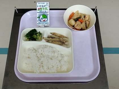 今日の給食の献立は、「きびなごてんぷら」「一口がんもとじゃがいもの煮もの」です。