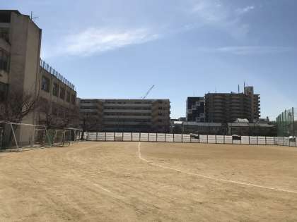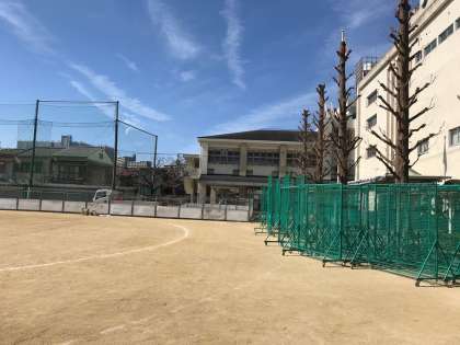 仮設校舎建設工事用フェンスが完成し、残された運動場の広さは半分ほどになりました。工事の進行によって、若干調整はしてもらえるそうです。体育の授業は、2層の体育館も使って行います。