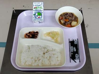 今日の給食の献立は、「肉じゃが」「とら豆の煮もの」です。