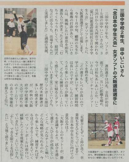 上段:「三国中学校2年生 『全日本中学生大会』女子ソフトの大阪選抜選手に」