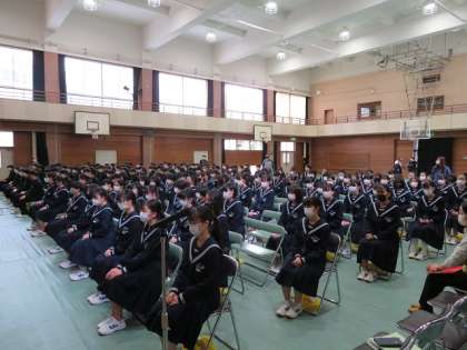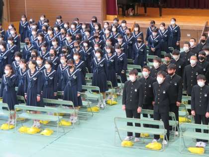 今日の3年生は、卒業式の練習、合唱の練習、校歌の録音、公立一般選抜事前指導などで過ごしました。起立・着席、合唱の声などとてもよかったです。今日卒業生が録音した校歌は、入学式や今後の学校行事等でも使っていきます。