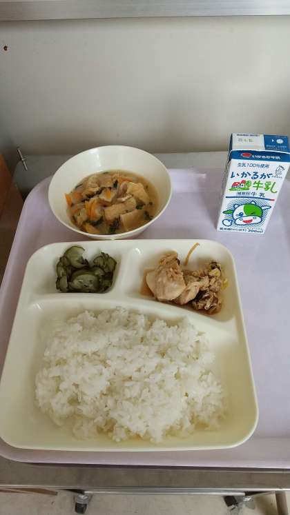 本日の給食は、 ●焼き鳥 ●味噌汁 ●きゅうりのゆず風味 です。