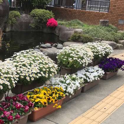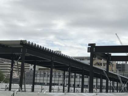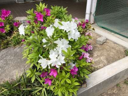 先週の金曜日に撮った学校風景です。ツツジの花がきれいに咲いています。仮設校舎への渡り廊下が完成に近づいています。