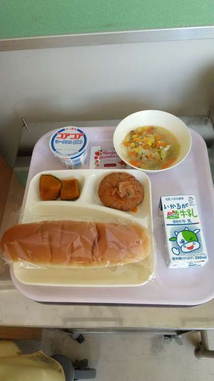 本日の給食は ●煮こみハンバーグ ●コーンスープ ●焼きカボチャ ●ヨーグルト でした。