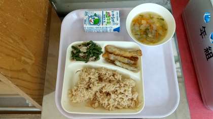 本日の給食は ●鰯天ぷら ●五目汁 ●豚肉とさんど豆の炒め物 です。