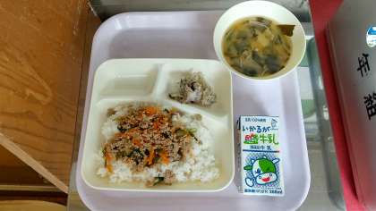 本日の給食は ●豚挽き肉とにらのそぼろ丼 ●みそ汁 ●キャベツの赤紫蘇和え です。