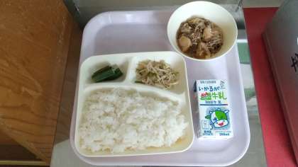 本日の給食は ●すき焼き煮 ●オクラの鰹梅風味 ●もやしとピーマンの胡麻炒め でした。