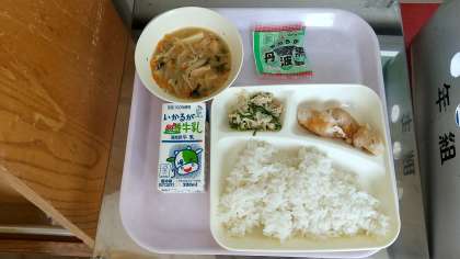 本日の給食は ●鶏肉のおろし醤油かけ ●味噌汁 ●野菜炒め ●ソフト黒豆 でした。