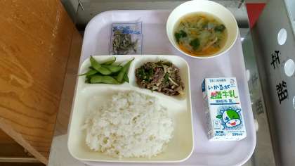 本日の給食は ●青椒肉絲 ●ハムと野菜の中華スープ ●枝豆 ●ミニフィッシュ です。