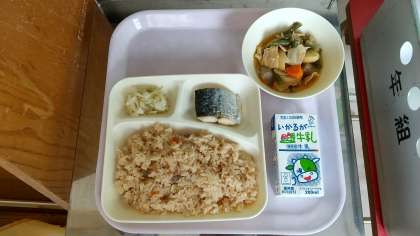 本日の給食は ●さごしの塩焼き ●豚肉とじゃが芋の煮物 ●キャベツの梅風味 です。