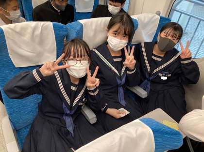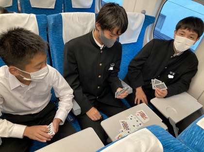 大阪駅まで、生徒たちは談笑したりトランプをして過ごしています。