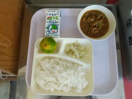 本日の給食は ●ポークカレーライス ●キャベツのピクルス ●みかん です。
